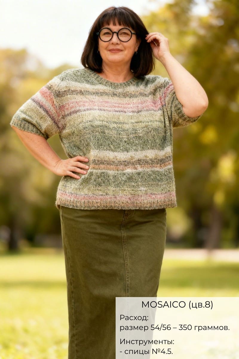 Благодаря подходящим размерам спиц от 4 до 4.5, ваши руки смогут творить без ограничений, будь то легкие летние свитера или изысканные аксессуары. Для создания женского свитера среднего размера потребуется всего 450–500 г пряжи Mosaico Linea Pura, что обеспечит вашему изделию уникальность и модный вид.